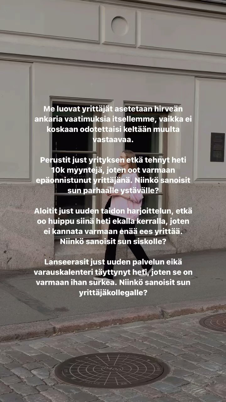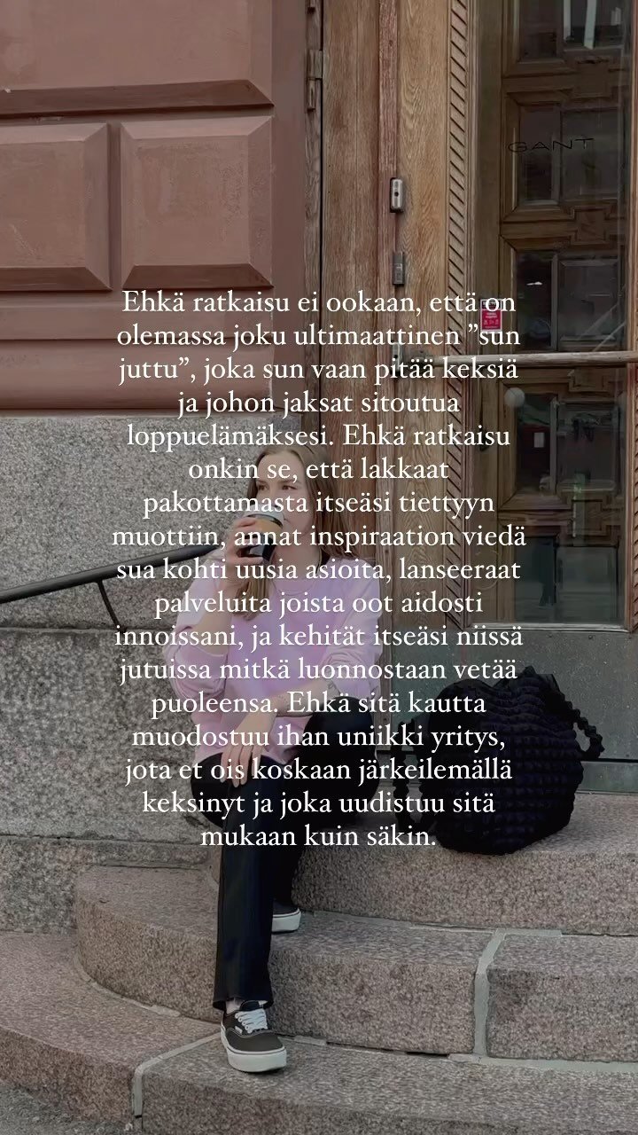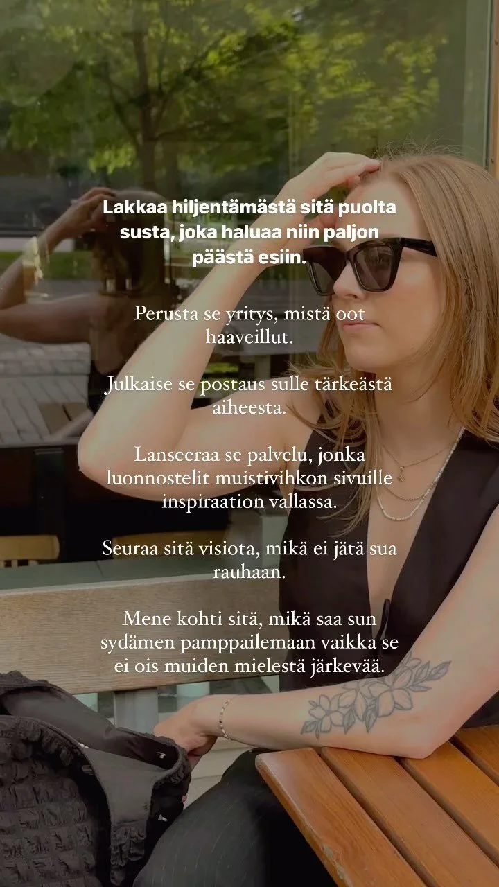 Totesin kolmekymppisenä, että työelämällä täytyy olla tarjota muutakin kuin ysistä viiteen toisten unelmien eteen puurtamista. Siispä perustin Muusa Creativen, mun luovan henkireiän ja intohimoprojektin, jonka myötä löysin jonnekin minne olin tietämättäni kaivannut vuosikausia - luovien sielujen ja pienyrittäjien kuplaan, jossa tuntuu että oon omieni parissa.